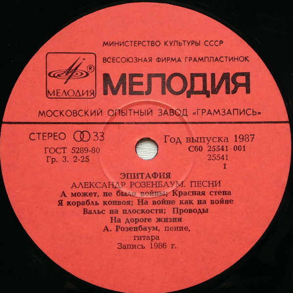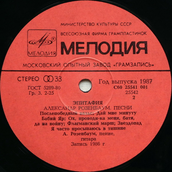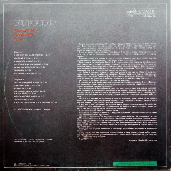 PLAK: NM KAPAK: VG FORMAT: LP ÜLKE: SSCB YAYINLANMA TARİHİ: 1987 LABEL: Melodiya KAT. NO: С30 25534