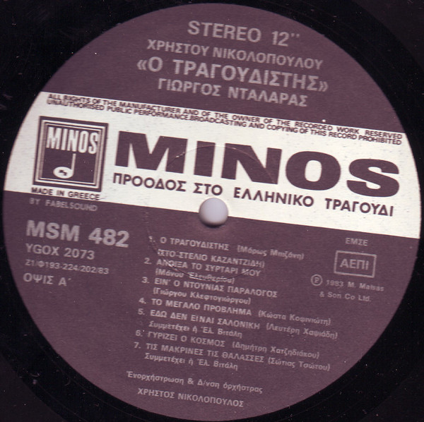 PLAK: VG+ KAPAK:  VG+ FORMAT: LP ÜLKE: Yunanistan YAYINLANMA TARİHİ: 1977 LABEL: Minos KAT. NO: MSM 310