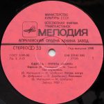 PLAK: G+ KAPAK: G+ FORMAT: LP ÜLKE: SSCB YAYINLANMA TARİHİ: 1989 LABEL: Melodiya KAT. NO: С30 25069 005