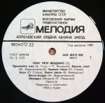 PLAK: EX KAPAK: EX FORMAT: LP ÜLKE: SSCB YAYINLANMA TARİHİ: 1985 LABEL: Melodiya KAT. NO: М60 47077 003