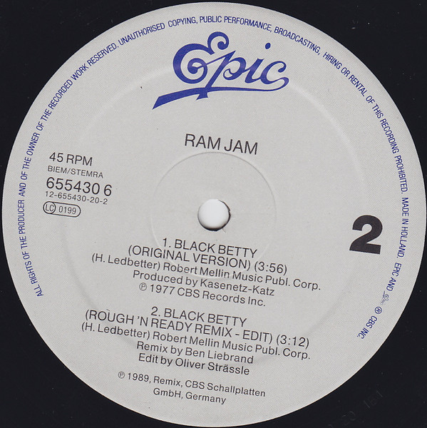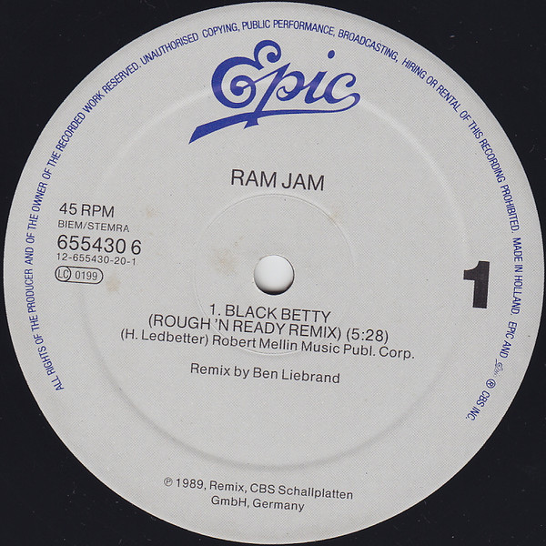 Ana Sayfa 12" MAXI SINGLE House / Techno Ram Jam – Black Betty (Remix) 12″ Maxi Single Plak (Early House)