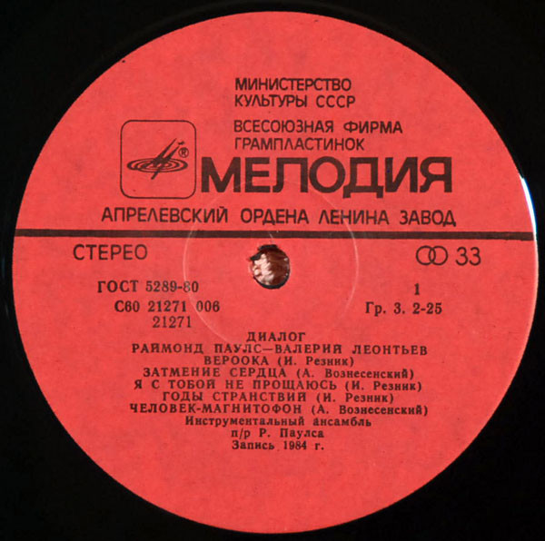 PLAK: NM KAPAK: VG FORMAT: LP ÜLKE: SSCB YAYINLANMA TARİHİ: 1987 LABEL: Melodiya KAT. NO: С30 25534